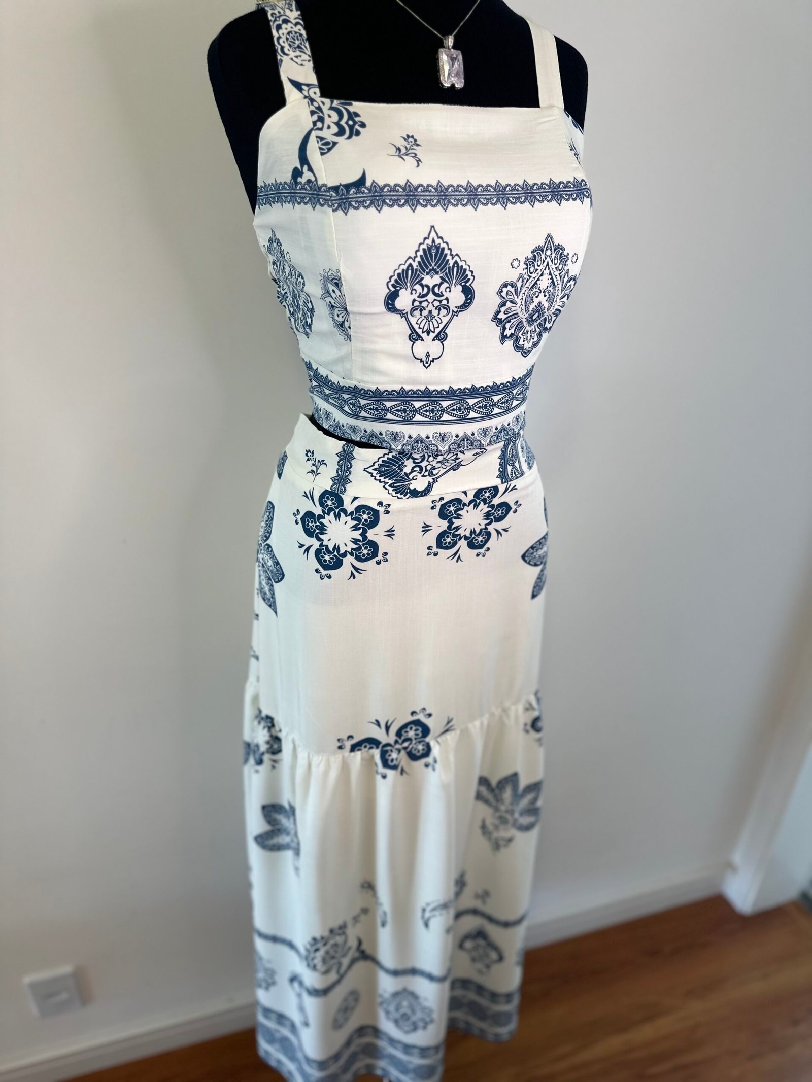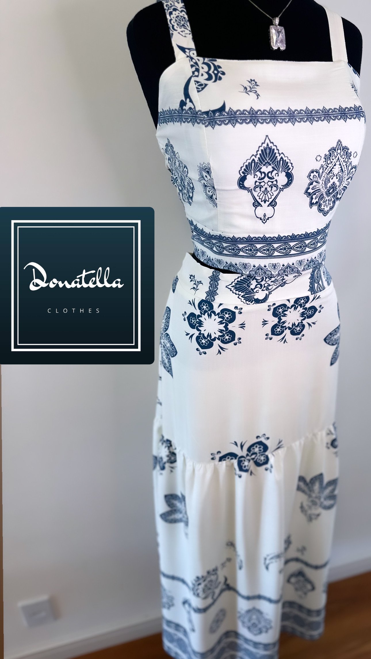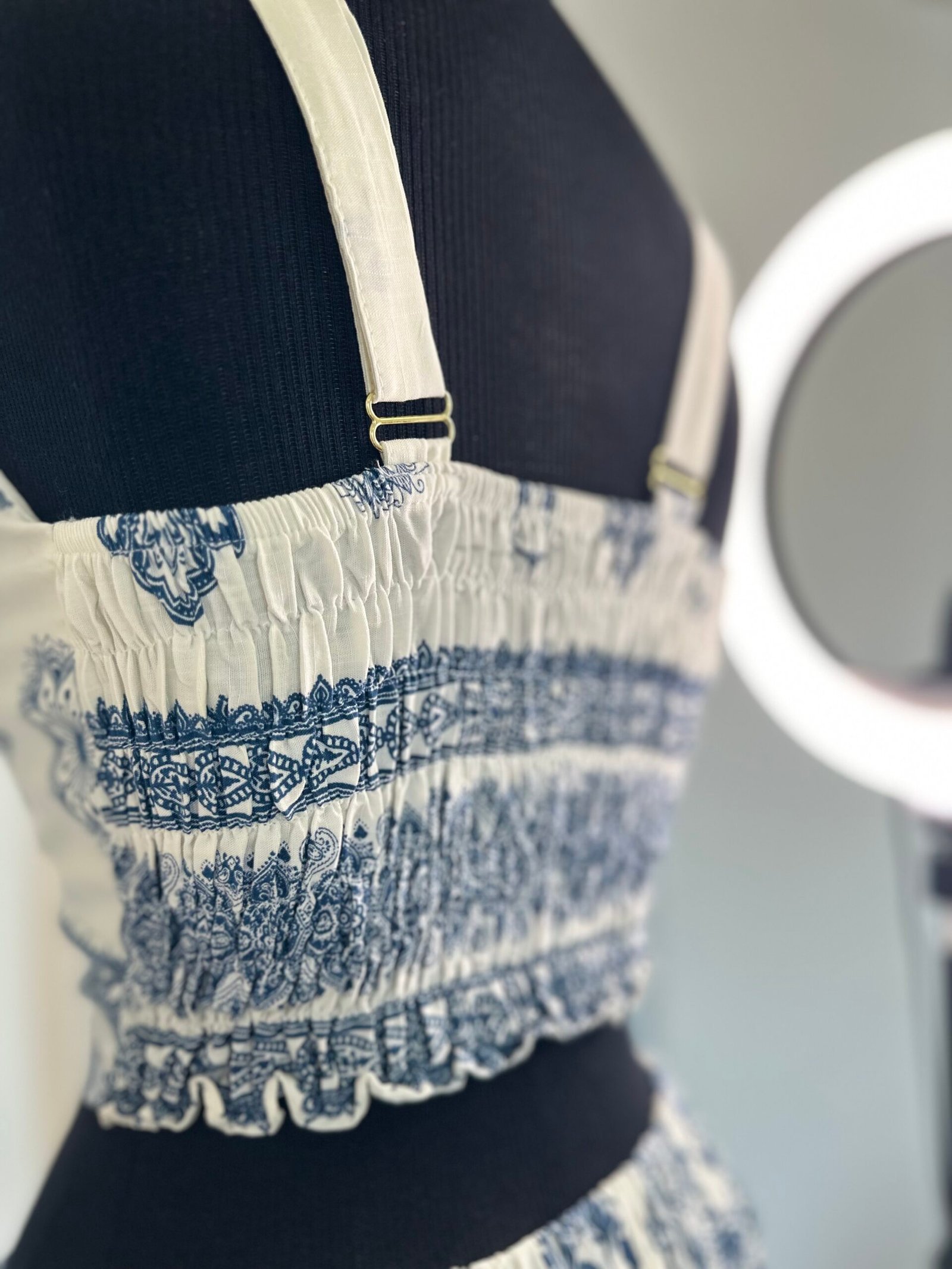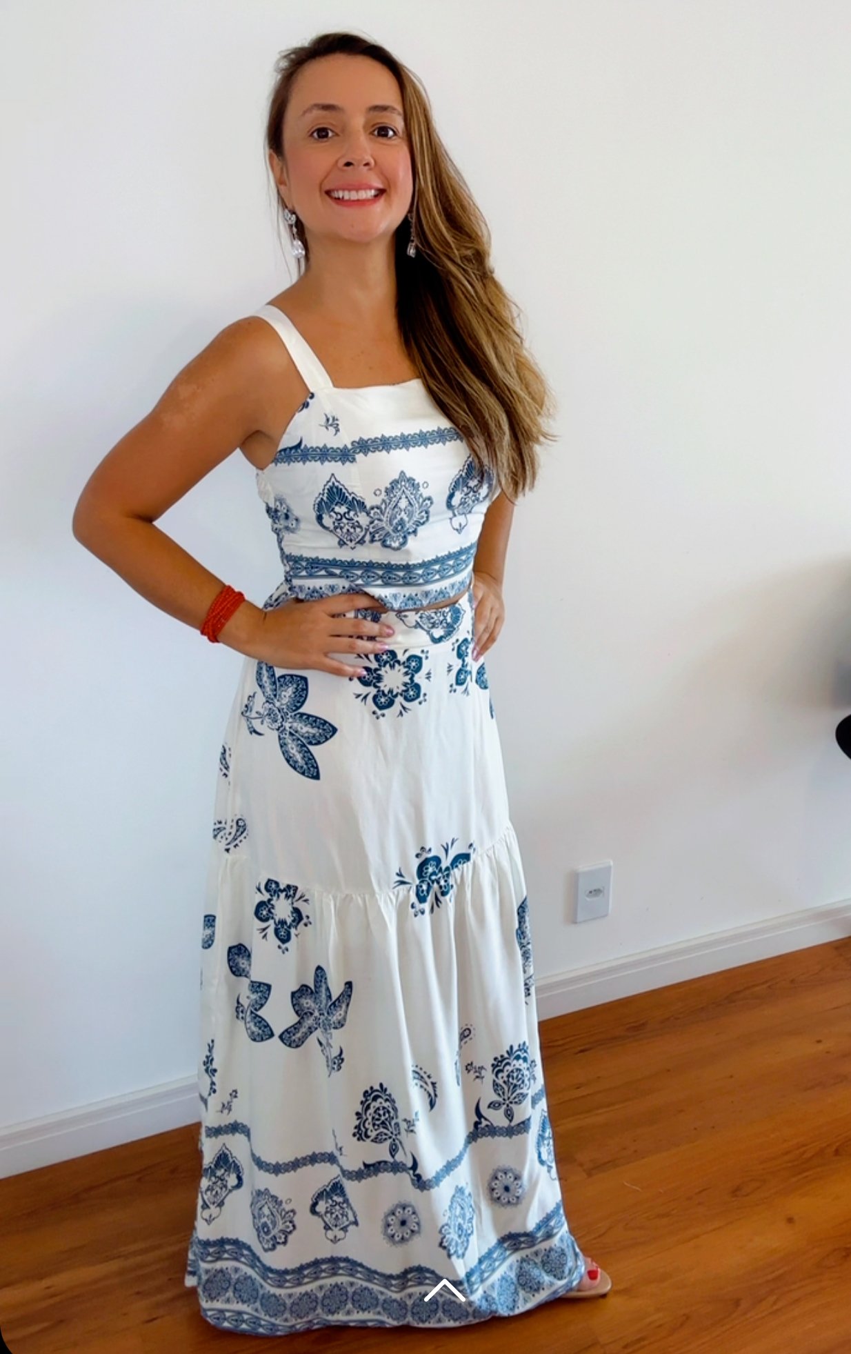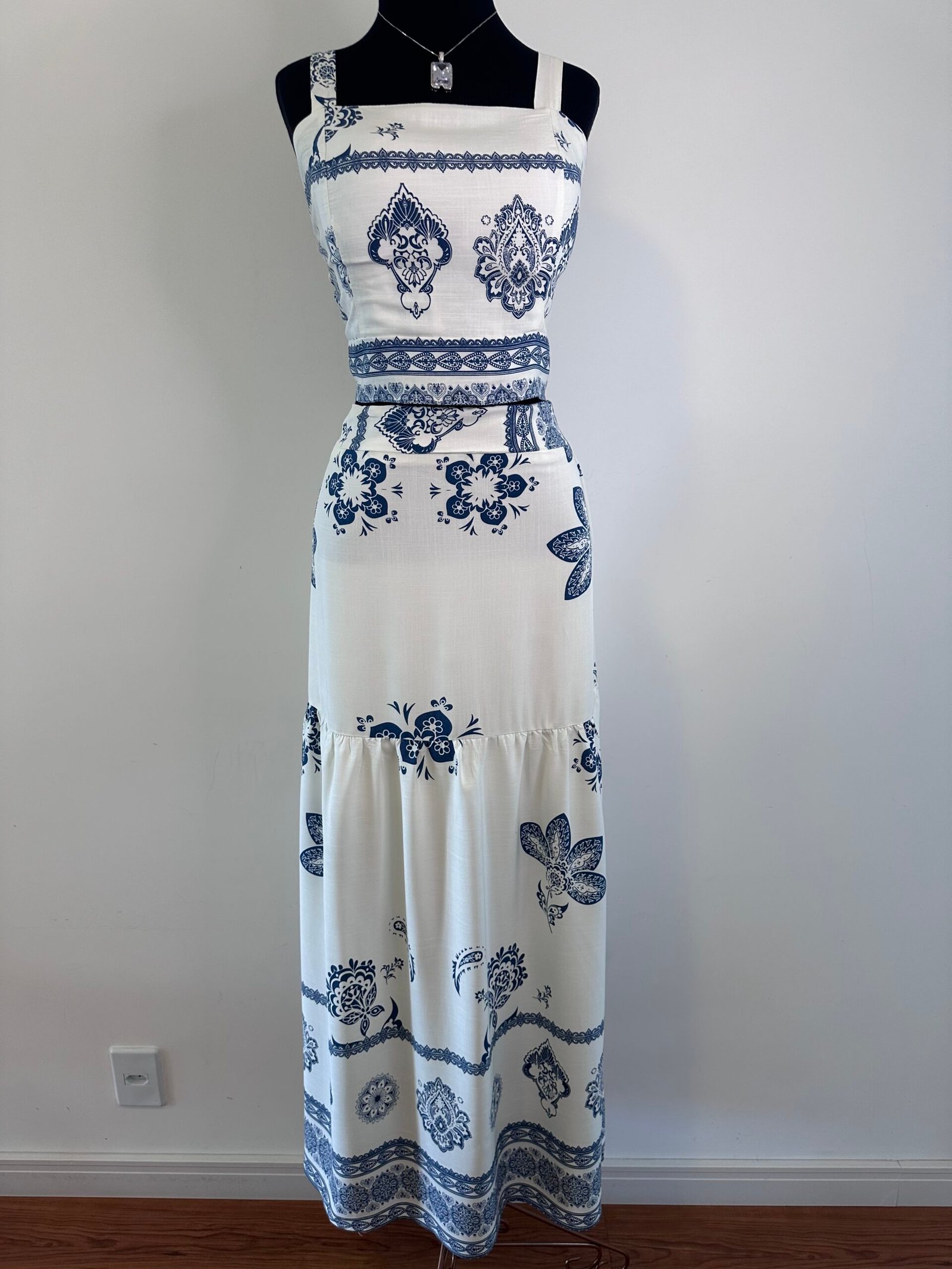 Conjunto viscose – cropped e calça. Branco com azul. Veste 36 ao 42.