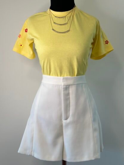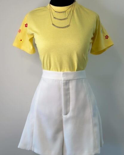 T-shirt amarela com flores na manga. 100% algodão. Veste 36 ao 42.